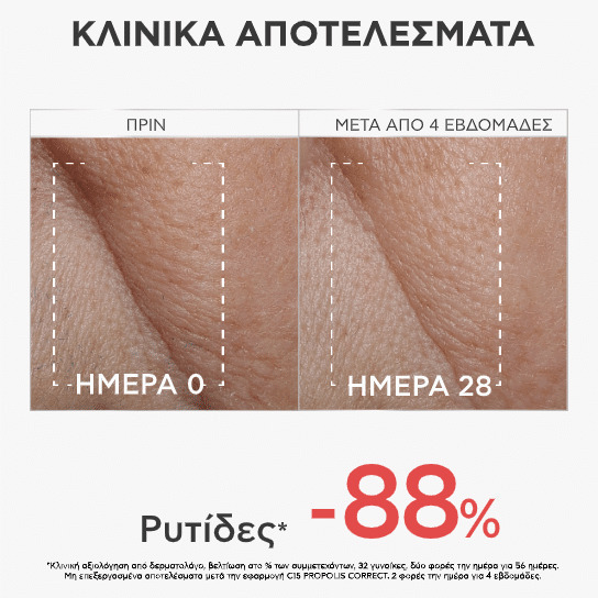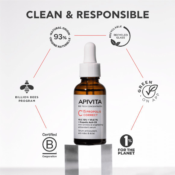 O ορός C15 PROPOLIS CORRECT αποτελεί έναν ισχυρό συνδυασμό αντιγήρανσης με βιταμίνες C & E και Πατενταρισμένη propolis AoX-CR.