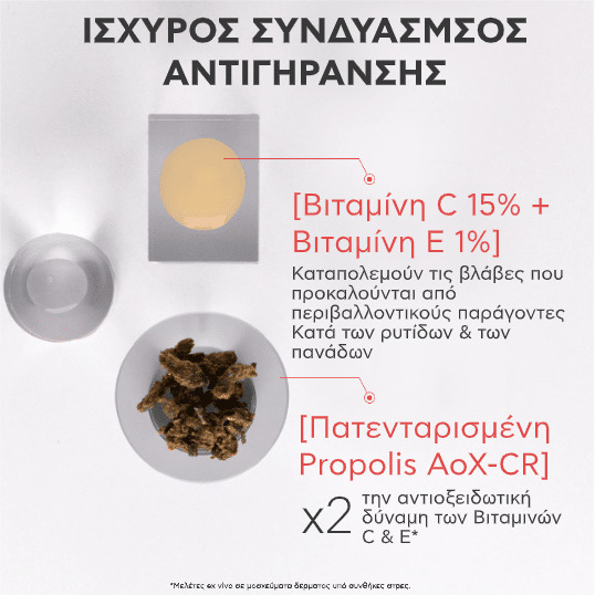 Η ισχυρή αντιοξειδωτική δράση αυτών των δύο κορυφαίων δερματολογικών δραστικών ενισχύεται από την αποκλειστική πατέντα της APIVITA, Propolis AoX-CR. Η ασύγκριτη αποτελεσματικότητά του έχει αποδειχθεί ότι ΔΙΠΛΑΣΙΑΖΕΙ την αντιοξειδωτική δύναμη των βιταμινών C + E1, ενισχύοντας σημαντικά τα αντιγηραντικά αποτελέσματα αυτού του ισχυρού συνεργιστικού συνδυασμού.