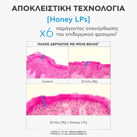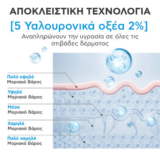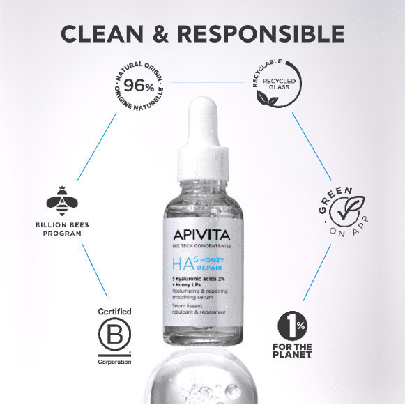 Χάρη σε ένα ευρύ φάσμα 5 διαφορετικών μοριακών βαρών Υαλουρονικού Οξέος σε συγκέντρωση 2% αναπληρώνει την υγρασία όλων των στιβάδων του δέρματος. Είναι ενισχυμένος με την αποκλειστική τεχνολογία της APIVITA, honey LPs, μια τεχνολογία ενθυλάκωσης των επουλωτικών συστατικών του μελιού για βαθιά εισχώρηση στην επιδερμίδα. Έχει αποδειχθεί ότι η τεχνολογία αυτή ενισχύει έως και 6 ΦΟΡΕΣ την παραγωγή του παράγοντα επανόρθωσης του επιδερμικού φραγμού, ενισχύοντας έτσι την επιδερμική αναδόμηση και την διατήρηση της υγρασίας της επιδερμίδας.