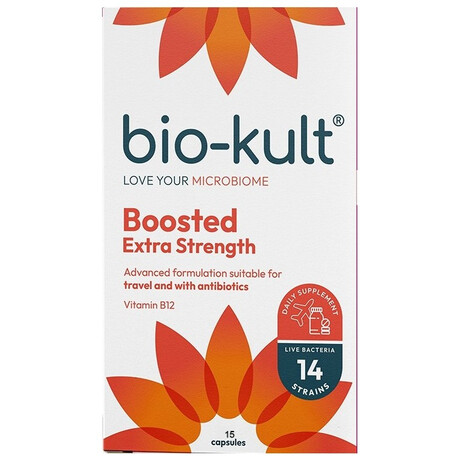 Το Bio-Kult Boosted είναι ενισχυμένη φόρμουλα που περιέχει τα ίδια 14 στελέχη ζωντανών φιλικών βακτηρίων που περιέχονται στο Bio-Kult® Advanced αλλά σε τετραπλάσια ποσότητα.