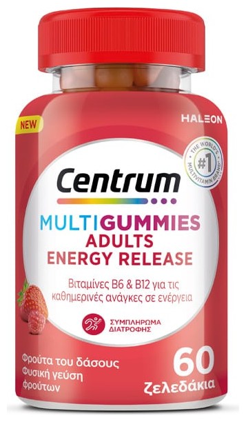 Τα Centrum Multi Gummies Energy Release περιέχουν θρεπτικά συστατικά που βοηθούν στην υποστήριξη της απελευθέρωσης ενέργειας και βοηθούν στην καθημερινή υποστήριξη του οργανισμού και του ανοσοποιητικού, ενώ έχουν υπέροχη γεύση βατόμουρο.