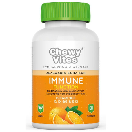 Tα Chewy Vites IMMUNE FUNCTION με βιταμίνη C περιέχουν 6 σημαντικές βιταμίνες και μέταλλα για τον οργανισμό: Βιταμίνη C, Βιταμίνη D, Βιταμίνη Β6, Βιταμίνη Β12, ψευδάργυρο και σελήνιο, που όλα