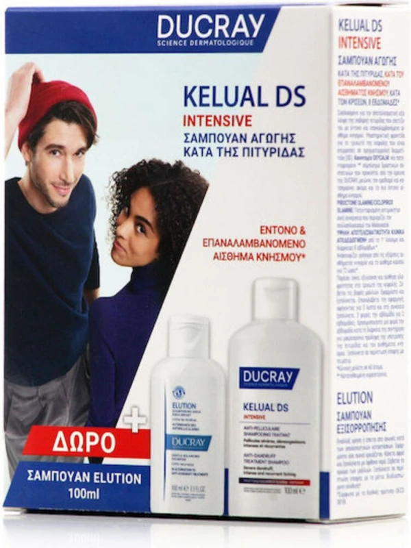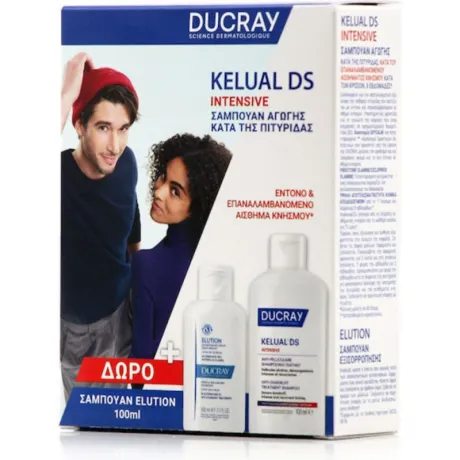 Tο πακέτο προσφέρει την εντατική αγωγή (KELUAL DS) για άμεση και ισχυρή αντιμετώπιση της σοβαρής πιτυρίδας και το εξισορροπητικό σαμπουάν (Elution) για τη διατήρηση και πρόληψη υποτροπών, διευκολύνοντας τον πλήρη κύκλο θεραπείας και συντήρησης. Η σύνθεση και η πρακτική φόρμουλα στοχεύουν στη μείωση λέπας, την καταπράυνση του τριχωτού και την αποκατάσταση άνεσης. ([ducray.com]( KELUAL DS (Anti‑dandruff / treatment shampoo) — επιλεγμένα συστατικά που αναφέρονται: WATER (AQUA), SODIUM LAURETH SULFATE, DECYL GLUCOSIDE, UNDECYLENAMIDOPROPYL BETAINE, LACTAMIDE MEA, LAURYL BETAINE, CETEARETH‑60 MYRISTYL GLYCOL, CITRIC ACID, FRAGRANCE (PERFUME), GLYCYRRHETINIC ACID, PIROCTONE OLAMINE, POLYQUATERNIUM‑10, SODIUM CHLORIDE, TRISODIUM ETHYLENEDIAMINE DISUCCINATE. (Προσοχή: σε ορισμένες αγορές/φορμουλαρίσεις αναφέρονται επίσης δραστικά όπως ciclopirox olamine — η σύσταση μπορεί να διαφέρει ανά χώρα/έκδοση). ([promofarma.com](