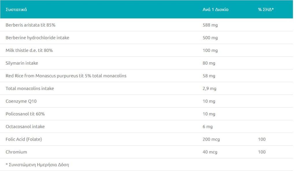 Περιέχει εκχύλισμα Berberis aristata, κόκκινο ρύζι ζυμωμένο από monascus purpureus, εκχύλισμα γαϊδουράγκαθου, φολικό οξύ, συνένζυμο Q10, χρώμιο και πολυκοσανόλες.