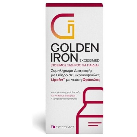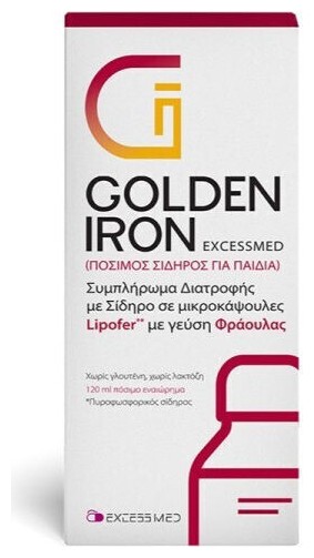 Το GOLDEN IRON EXCESSMED σε πόσιμο εναιώρημα είναι ένα συμπλήρωμα διατροφής που περιέχει πυροφωσφορικό σίδηρο σε μικροκάψουλες Τεχνολογίας Lipofer ®, βιταμίνη Β6 (υδροχλωρική πυριδοξίνη) και βιταμίνη Β12 (κυανοκοβαλαμίνη). Με εξαιρετική γεύση φράουλας, το προϊόν είναι κατάλληλο για παιδιά > 3 ετών.