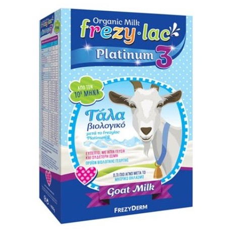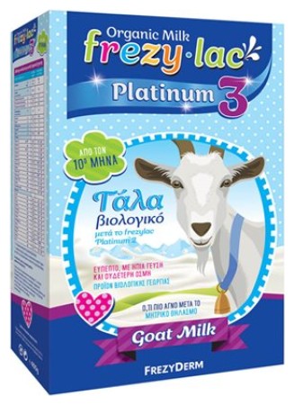 Το FREZYLAC PLATINUM PLUS 3 είναι αγνό βιολογικό κατσικίσιο γάλα σε σκόνη, κατάλληλο για βρέφη από τον 10ο μήνα ως μετάβαση από τον θηλασμό ή από το FREZYLAC PLATINUM 2. Μπορεί επίσης να αντικαταστήσει οποιοδήποτε γάλα στη συνέχεια της νηπιακής και παιδικής ηλικίας. Παράγεται από την εναλλακτική, υγιεινή και φιλική προς το περιβάλλον βιολογική αιγοκτηνοτροφία και εξασφαλίζει στο βρέφος μία φυσική, ισορροπημένη διατροφή. Είναι εμπλουτισμένο με πρωτεΐνες, βιταμίνες, μέταλλα και ιχνοστοιχεία, κορεσμένα και πολυακόρεστα λιπαρά οξέα (σε ιδανική αναλογία) και προσφέρει επιπλέον οφέλη στην πέψη, τη διατήρηση της εντερικής χλωρίδας και τον μεταβολισμό των θρεπτικών συστατικών, χάρη στη διαφορετική πρωτεϊνική δομή του κατσικίσιου γάλατος.