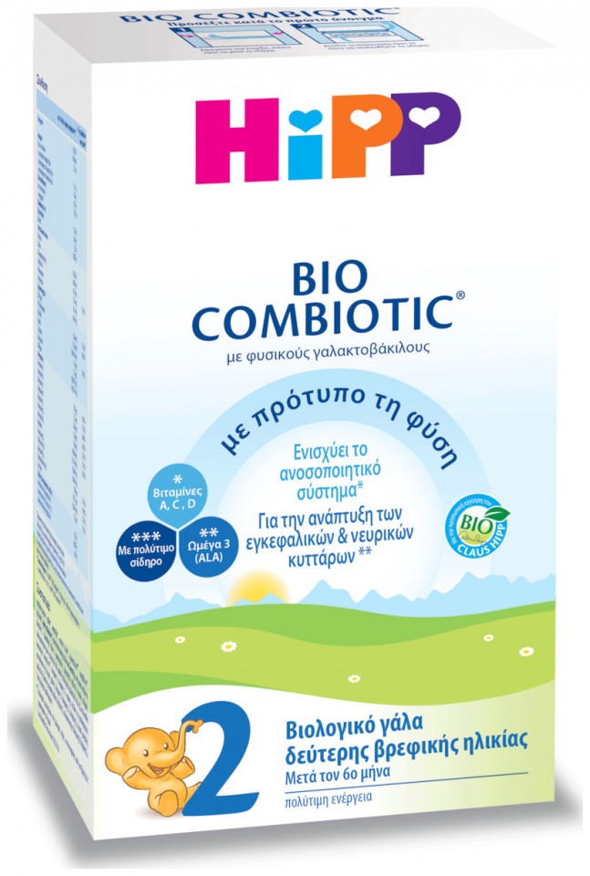 Βιολογικό Γάλα 2ης Βρεφικής Ηλικίας 6-12 Μηνών. Το βιολογικό γάλα HiPP είναι σύμφωνο με όλες τις προδιαγραφές βιολογικής παραγωγής του γερμανικού κράτους, πηγαίνοντας ένα ακόμη βήμα πιο πέρα με τη σφραγίδα πιστοποίησης HiPP. Στη σύνθεσή τους δεν υπάρχουν γενετικώς μεταλλαγμένες ουσίες, ενώ περιέχουν ωμέγα 3 φυσικής προέλευσης, πρεβιοτικά και σίδηρο, σε ποσότητες ανάλογες με την ηλικία και τις ανάγκες του βρέφους, έτσι ώστε να του προσφέρει ό,τι καλύτερο χρειάζεται γι' αυτή τη περίοδο της ζωής του.