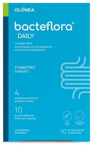 Το BacteFlora είναι συμβιωτικό συμπλήρωμα διατροφής 4 κύριων προβιοτικών ειδών, με 7 δισεκατομμύρια προβιοτικά βακτήρια ανά κάψουλα και ινουλίνη, μια πρεβιοτική φυτική ίνα που φτάνει άπεπτη στο έντερο και χρησιμοποιείται ως τροφή από τα φιλικά βακτήρια.