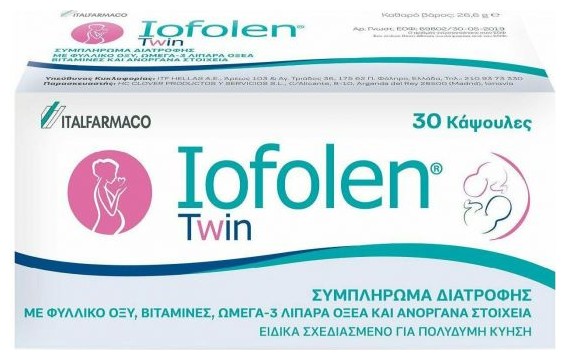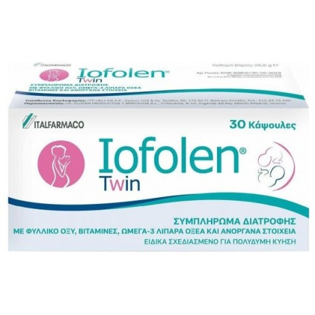 Το συμπλήρωμα διατροφής Iofolen Twin της Italfarmaco είναι ένα συμπλήρωμα διατροφής ειδικά σχεδιασμένο, σύμφωνα με τις Διεθνείς Κατευθυντήριες οδηγίες για την κάλυψη των αυξημένων διατροφικών αναγκών των γυναικών που βρίσκονται σε κατάσταση πολύδυμης κύησης, συμβάλλοντας στη βέλτιστη ανάπτυξη των εμβρύων.Κύρια συστατικά: Φυλλικό οξύ : συμβάλλει στην φυσιολογική ανάπτυξη του μητρικού ιστού κατά τη διάρκεια της εγκυμοσύνης, στη φυσιολογική ψυχολογική λειτουργία και στη μείωση της κούρασης και της κόπωσης. Βιταμίνη Β12: συμβάλλει στο φυσιολογικό μεταβολισμό της ενέργειας, στη φυσιολογική λειτουργία του νευρικού και ανοσοποιητικού συστήματος και στη διατήρηση της φυσιολογικής ψυχικής λειτουργίας, ενώ συμμετέχει ενεργά στη διαδικασία κυταρρικής διαίρεσης. Βιταμίνη D : συμβάλλει στη φυσιολογική απορρόφηση και εναπόθεση του ασβεστίου καθώς και στην ανάπτυξη και διατήρηση των φυσιολογικών ιστών των παιδιών. Ιώδιο: συμβάλλει στη φυσιολογική γνωσιακή λειτουργία. Σίδηρος: συμβάλλει στη φυσιολογική μεταφορά του οξυγόνου στο σώμα και στη διαδικασία κυτταρικής διαίρεσης. Ωμέγα -3 λιπαρά οξέα: απαραίτητα θρεπτικά συστατικά για τον οργανισμό.Το DHA συμβάλλει στη φυσιολογική ανάπτυξη του εγκεφάλου και των οφθαλμών των εμβρύων. Συνιστώμενη δοσολογία: 1 κάψουλα Iofolen Twin της Italfarmaco ημερησίως με ένα ποτήρι νερό.