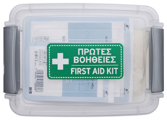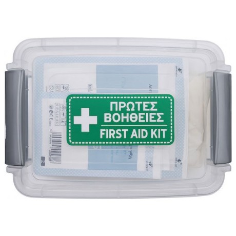 Το κουτί πρώτων βοηθειών περιέχεται σε ένα διαφανές κουτί με την ένδειξη "First Aid Kit/Πρώτες Βοήθειες."