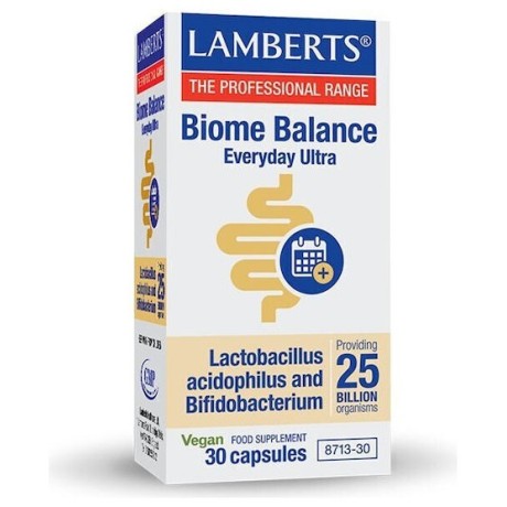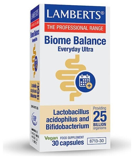 Το Lamberts Biome Balance Everyday Ultra αποτελεί το ισχυρότερο σκεύασμα φιλικών βακτηρίων της εταιρείας, παρέχοντας 25 δισεκατομμύρια βακτήρια ανά κάψουλα (κατά την παρασκευή). Η προηγμένη σύνθεση του συνδυάζει τα κλινικά τεκμηριωμένα στελέχη Lactobacillus acidophilus και Bifidobacterium bifidum, τα οποία χρησιμοποιούνται σε μεγάλο αριθμό επιστημονικών μελετών για την υποστήριξη του εντερικού μικροβιώματος.