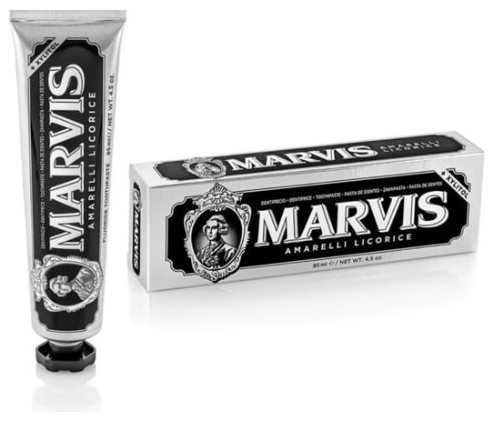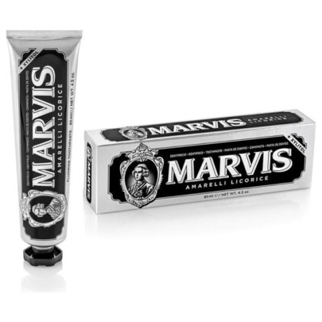 Η Marvis Amarelli Licorice είναι μια οδοντόκρεμα με πλούσια και κρεμώδης υφή που συνδυάζει την δελεαστική γεύση της γλυκόριζας μαζί με την φρεσκάδα της μέντας. Είναι σχεδιασμένη για να αφαιρεί την πλάκα, την πέτρα και για να χαρίσει ένα αστραφτερό και ολόλευκο χαμόγελο. Για την παραγωγή της συγκεκριμένης οδοντόκρεμας, η Marvis συνεργάζεται με την Ιταλική φίρμα Amarelli η οποία παράγει γλυκόριζα από το 1731 για να αποδώσει μια γλυκόπικρη και ιδιαίτερη γεύση στην Marvis Amarelli licorice που δεν πρέπει να λείψει από τα προϊόντα της οδοντιατρικής σας φροντίδας.