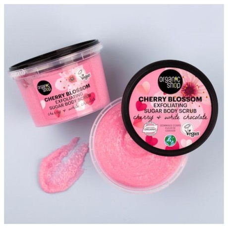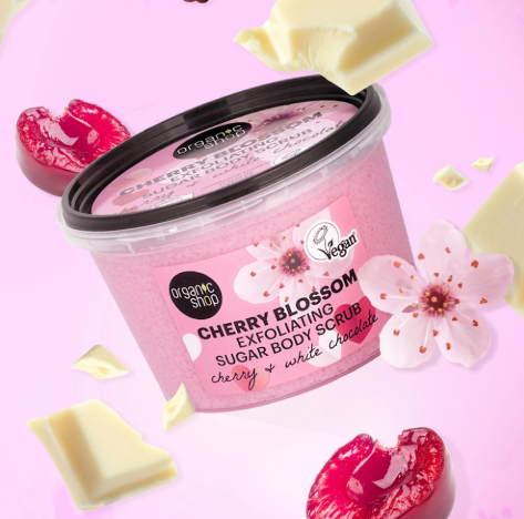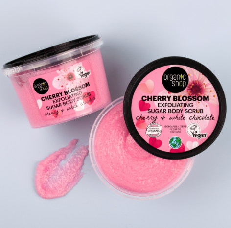 Scrub σώματος που περιποιείται το δέρμα, με βιολογικό έλαιο κερασιού και βιολογικό βούτυρο κακάο.