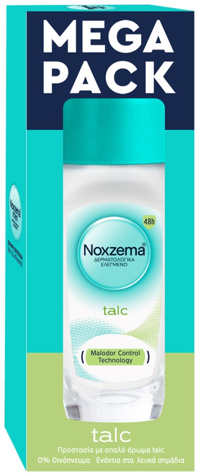 To γυναικείο αντιιδρωτικό αποσμητικό rollon Noxzema Talc, με κλινικά αποδεδειγμένη απαλότητα, τεχνολογία Malodor Control και μοναδικό άρωμα talc, απελευθερώνει άρωμα φρεσκάδας που διαρκεί, εξασφαλίζει έλεγχο της εφίδρωσης και προσφέρει αποτελεσματική 48ωρη προστασία από τον ιδρώτα και την κακοσμία. Είναι δερματολογικά ελεγμένο, φιλικό με την επιδερμίδα, έχει σύνθεση ενάντια στα λευκά σημάδια, απαλό θηλυκό άρωμα και δεν περιέχει οινόπνευμα. Εφαρμόστε ένα λεπτό στρώμα στην περιοχή της μασχάλης.