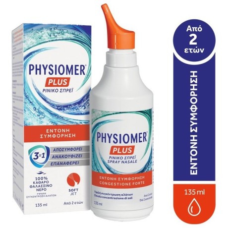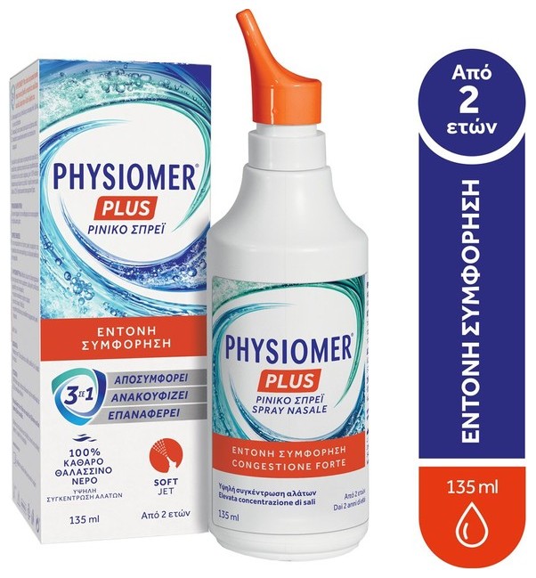 Για την αντιμετώπιση της έντονης ρινικής συμφόρησης που προκαλείται από το κοινό κρυολόγημα, την αλλεργική ρινίτιδα και την ιγμορίτιδα. Το Physiomer Plus βοηθά στη μείωση της λήψης φαρμάκων στην περίπτωση έντονης συμφόρησης, αλλεργικής ρινίτιδας και ιγμορίτιδας και είναι ασφαλές: