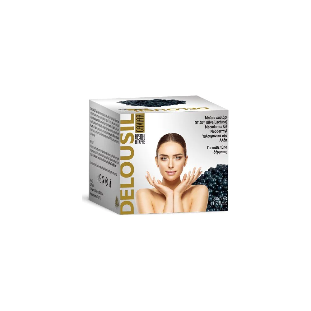 H DELOUSIL Caviar Κρέμα Ημέρας είναι ιδανική για εντατική θρέψη και ενίσχυση της υγείας της επιδερμίδας του προσώπου και του λαιμού. Περιέχει το γνωστό και ως «υπερτροφή» εκχύλισα Χαβιαριού, συστατικό που συμβάλλει ενεργά στην αναζωογόνηση, τόνωση και αύξηση της ελαστικότητας του δέρματος. Το Υαλουρονικό οξύ και η Αλόη που περιέχει, μαζί µε τα δραστικά συστατικά Neodermyl και Eclaline δημιουργούν έναν πανίσχυρο συνδυασμό που προσφέρει αναζωογόνηση, λάμψη, βελτίωση της υφής και αύξηση της ελαστικότητας του δέρματος. Τα πλούσια σε βιταμίνες έλαια Macadamia και Jojoba παρέχουν άμεση ενυδάτωση και μαζί µε τα εκχυλίσματα Ροδιού και Άγριας Τριανταφυλλιάς, βοηθούν στη διατήρηση της υγείας και της σφριγηλότητας της επιδερμίδας. Περιέχει επίσης το καινοτόμο συστατικό QT 40® (εκχύλισα Ulva Lactuca) που βοηθάει στην αναμόρφωση του οβάλ του προσώπου. Διατίθεται σε συσκευασία των 50ml.