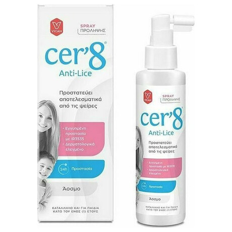 Η άοσμη αντιφθειρική λοσιόν πρόληψης Cer8 σε μορφή spray είναι ειδικά σχεδιασμένη για την καθημερινή προστασία των μαλλιών από τις ψείρες, χωρίς να τα ξηραίνει ή να τα λαδώνει.